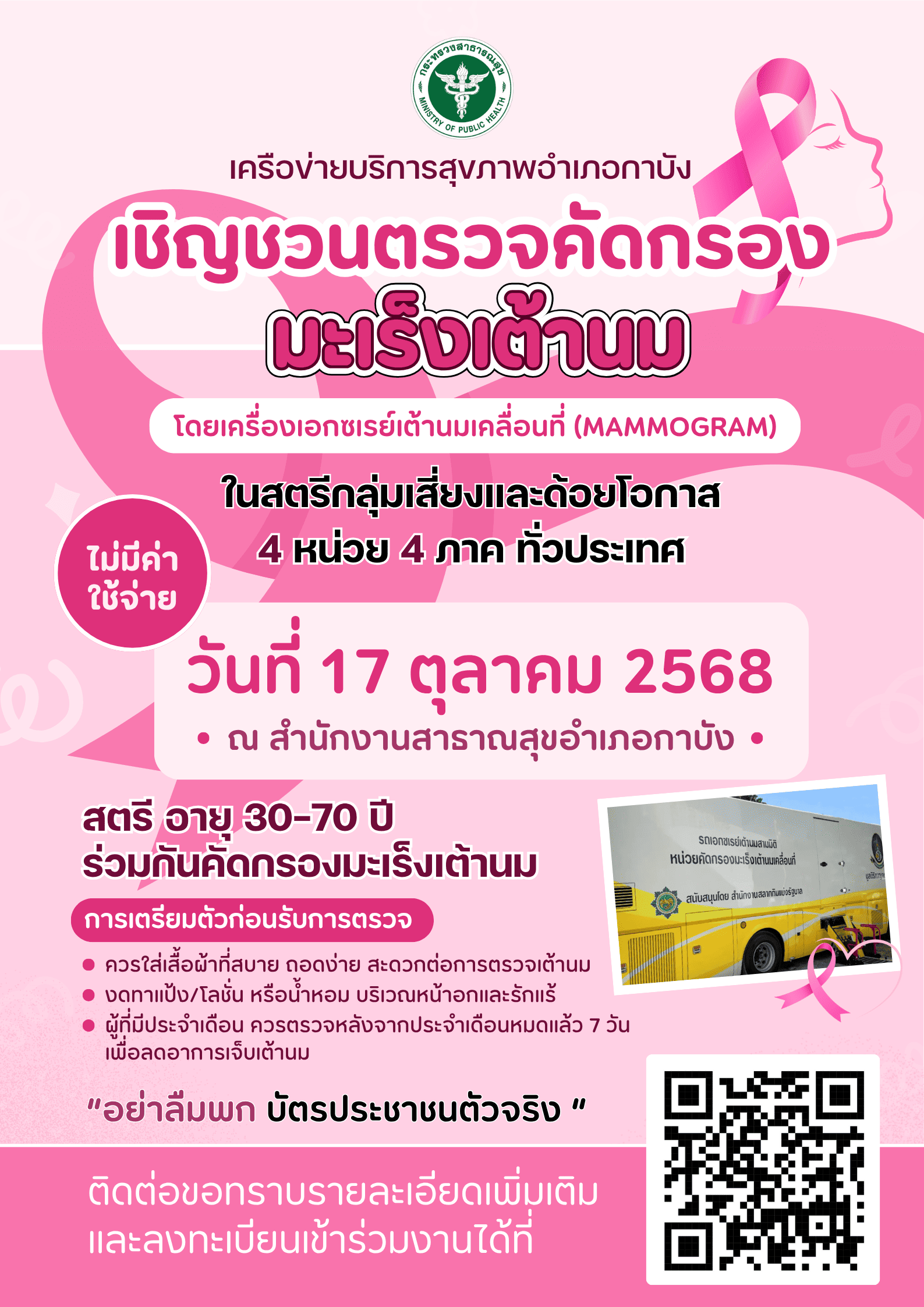 เชิญชวนตรวจคัดกรองมะเร็งเต้านมโดยเครื่องเอกซเรย์เต้านมเคลื่อนที่ (Mammogram)